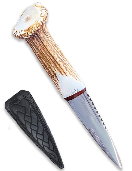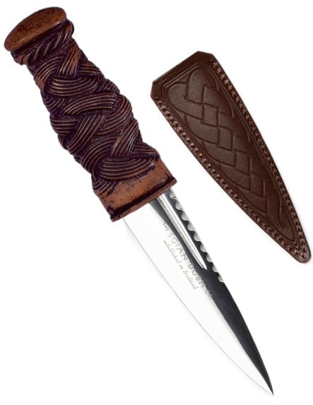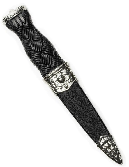 Highlanders typically carried full sets of various weapons. Sgian / Skean Dubh, pronounced "Skeen Doo" means "black knife" in Gaelic. The sgian dubh knife was a small backup weapon and utility blade, usually concealed in the folds of the Great Kilt. Over the years, it became customary to take out your sgian dubh and tuck it in the top of your kilt hose when you were among friends. “Black knife” may refer to the dark colored wood used for the handles, or to the idea that it was a hidden weapon.