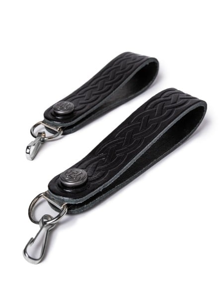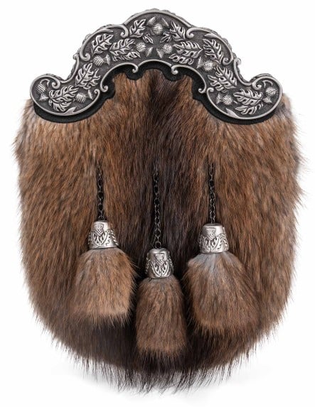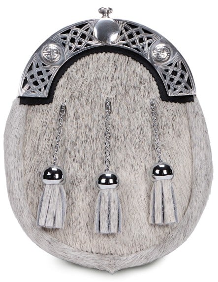 The formal sporran can also be recognized by the decorative tassels. These may be made of leather strips. Or if it is a fur full dress sporran, they may be made of fur. In either case each tassel is caped by a metal ball or bell. On an especially classy sporran, these may be cast in pewter to match the cantle and include raised designs such as Celtic knotwork.