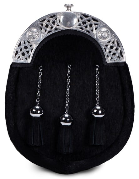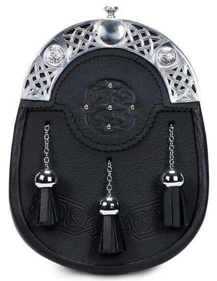 A Dress Sporran is usually reserved for formal events. They are oval-shaped and feature a metal cantle (semi-circular closure decoration) on top. A typical full dress sporran will be made of black leather with a layer of fur on the front.
