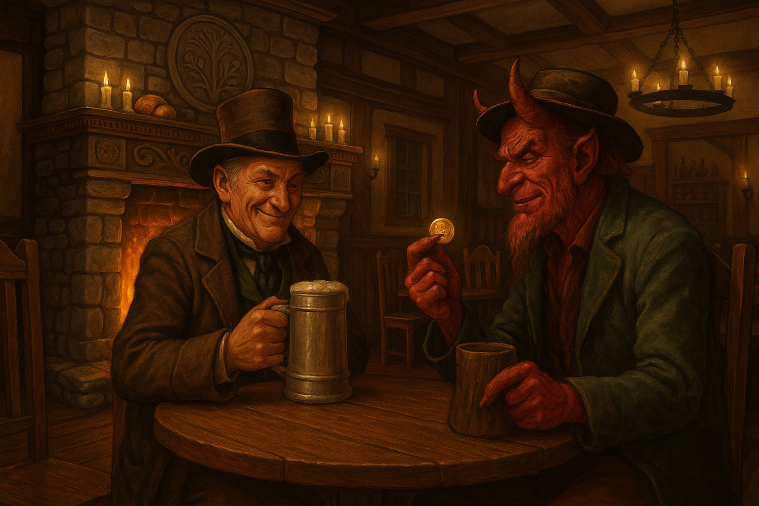 The devil, proud as ever and always a show-off, said, “We’ll pay with hellish gold of course!” and transformed himself into a dazzling golden coin on the bar. But Jack, quick as a crow, scooped a silver crucifix out of his pocket and slammed it down on top of the coin. The devil was trapped in his coin form!