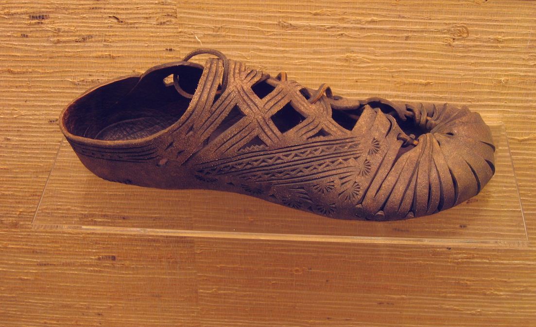 Simple leather “moccasins” were either made using a pattern of thin leather strips bound together, or of leather pieces perforated with slashes or holes to allow water to drain quickly. This was essential for preventing foot fungus and infection. In colder weather, the shoes might be stuffed with straw or roving as insulation.