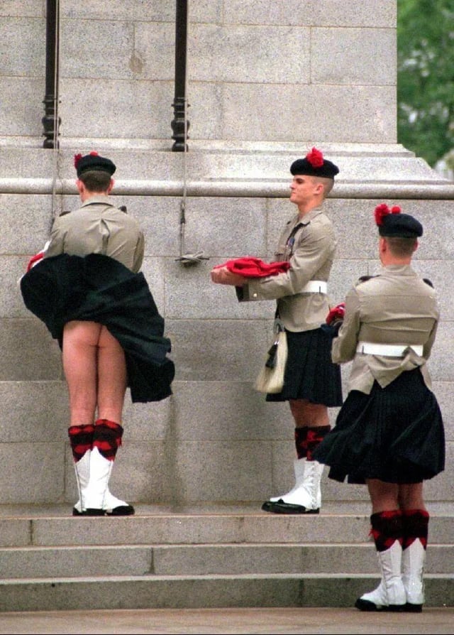 Well…we do have a certain famous photograph! In 1997, a very obvious incident of “regimental gone wrong” occurred when blustery conditions during a military ceremony in Hong Kong resulted in a soldier of the Black Watch being exposed in front of the press.