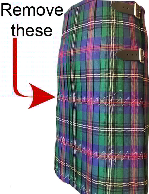 - Remove the basting stitching. Some kilts arrive with what is called "basting stitches" still in the pleats. These are are sometimes used by a kilt maker to keep the pleats alligned during constructioin and also nice and neat during shipping. They are easy to snip out before wearing.
