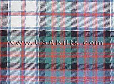 From the 1880 'Clans Originaux'.  The original Johnstons sett used black for the two wide tramlines on white instead of blue as shown here which is the choice of today's weavers. Sample in Scottish Tartans Authority's Dalgety Collection.